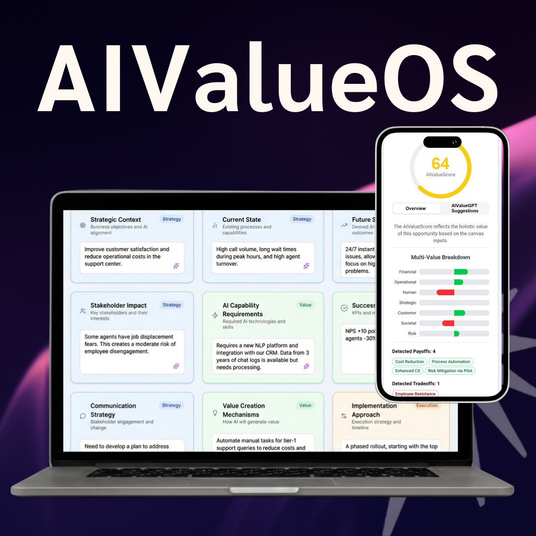 From vision to execution. The AI Value OS translates principles into systems that leaders can measure, manage, and scale. Frameworks, assessments, and tools that turn insight into impact.